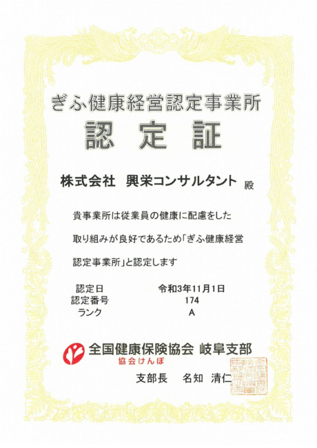 投稿日:2021.11.01 最終更新日:2026.02.26 お知らせ ぎふ健康経営認定事業所の認定を受けました 弊社は、ぎふ健康経営認定事業所の認定を受けました。 これからも「健康で楽しく」を経営理念に健康経営を進めて まいります。