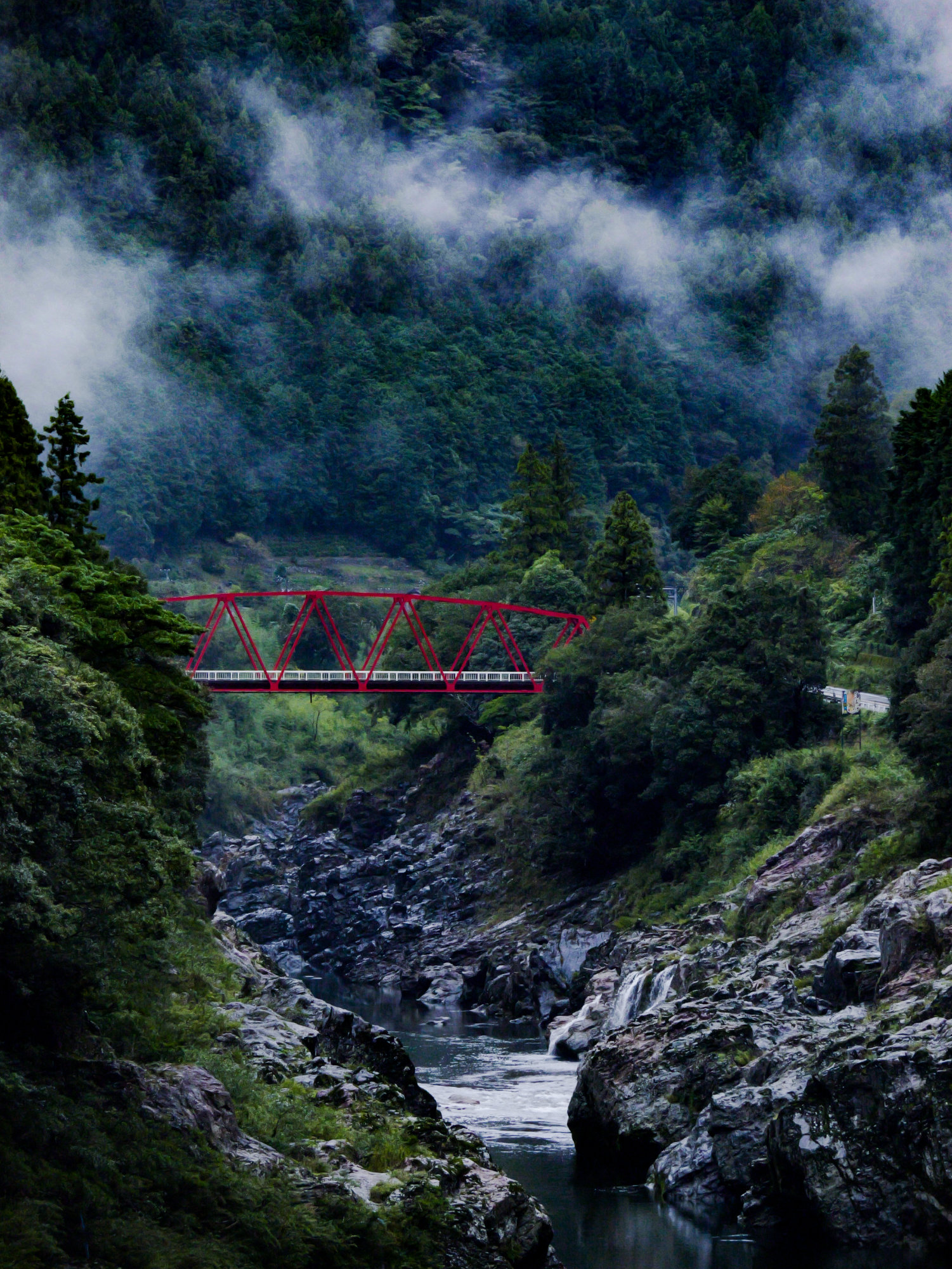タイトル:霧中の渓谷、紅の架け橋